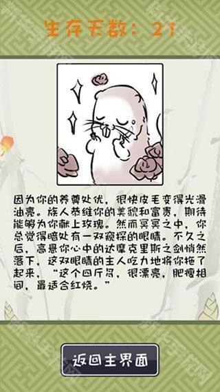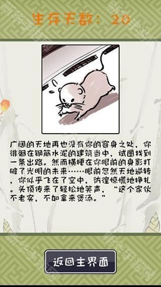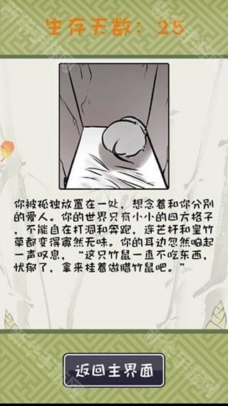 竹鼠活下去是一款文字养成类休闲游戏。玩家在游戏里化身一只竹鼠,应对养殖场里的各类挑战,像抑郁、肥胖、中暑等状况,借助二选一的选择题来把控竹鼠的精神、可爱、武力和健康这四大属性。游戏采用清新可爱的画风,融合手绘简笔画风格与街机风格的音乐,打造出治愈系的氛围。不一样的选择会触发不同的结局,玩家需要尽力让竹鼠存活更久的时间,解锁各种各样的成就。