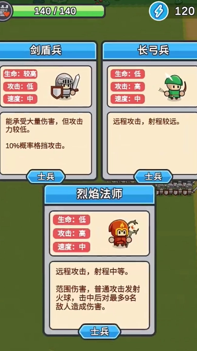 3、士兵牌与强化牌的组合方式丰富多样,剑盾兵的厚重防御、长枪兵的穿刺攻击、长弓兵的远程射击、牧师的治愈能力、刺客的突袭技巧、火焰法师的烈焰法术。