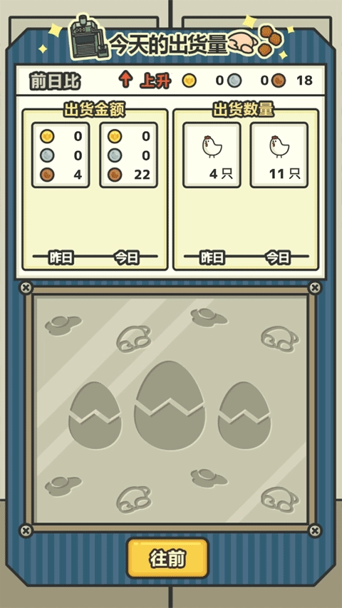 3、游戏昼夜循环机制,白天是生产时段,时长固定为三分钟。在这短暂的三分钟内,点击操作能让机器工作时间减少10秒,助力小鸡加速成长、提前出售以获取更多收益。此外,你可以选择放生价格较低的鸡,为昂贵鸡种腾出鸡栏空间,让它们在栏内生蛋。三分钟生产时间结束后,系统会弹出营业报告,清晰展示当日卖出的鸡的数量、赚取的总金额,还会与前一天的数据进行对比,这种设计颇具激励性。