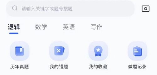 首先,我们需要打开软件。进入软件后,在界面最下方的一行中可以找到【题库】选项。点击进入【题库】后,页面最上方直接显示的就是【历年真题】板块。接下来需要选择对应的学科,比如数学、逻辑等。