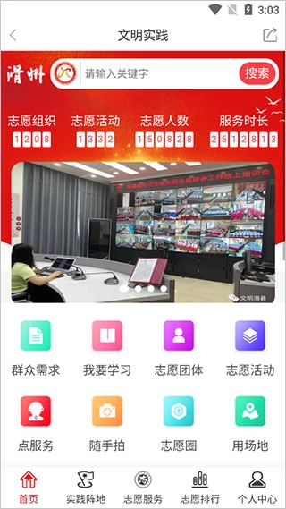文明实践页面包含多个模块,用户能够通过这些模块参与各类志愿服务。
