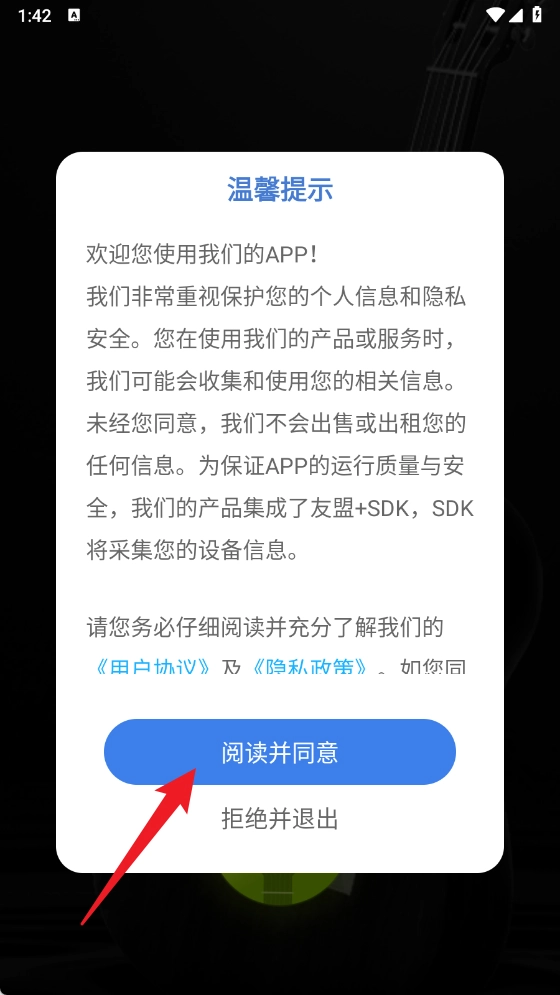 首次打开应用时会弹出温馨提示,用户需阅读并同意《用户协议》与《隐私政策》后,才能正常使用应用功能。