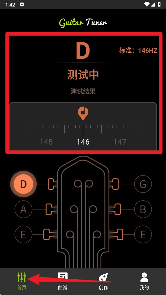 吉他调音功能在首页就能直接使用,点击对应的弦位就能检测频率,还能实时显示调音结果是否达到标准。