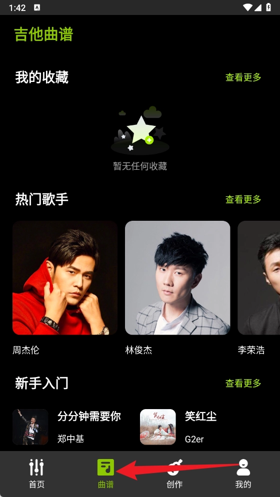 进入曲谱板块,能够浏览热门歌手与歌曲对应的吉他曲谱,还可以收藏常用曲谱,以便随时进行练习。