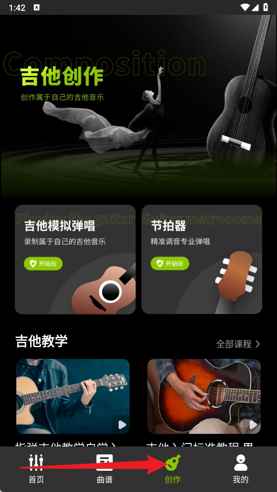 创作页面配备了吉他模拟弹唱与节拍器功能,助力用户进行音乐创作的个性化定制,同时增强演奏时的节奏感。