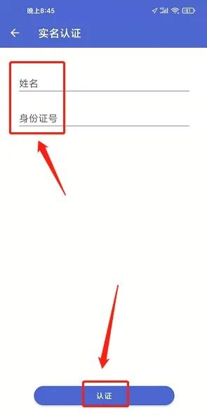 进入实名认证页面,填写姓名和身份证号后,点击【认证】按钮就可以完成操作。