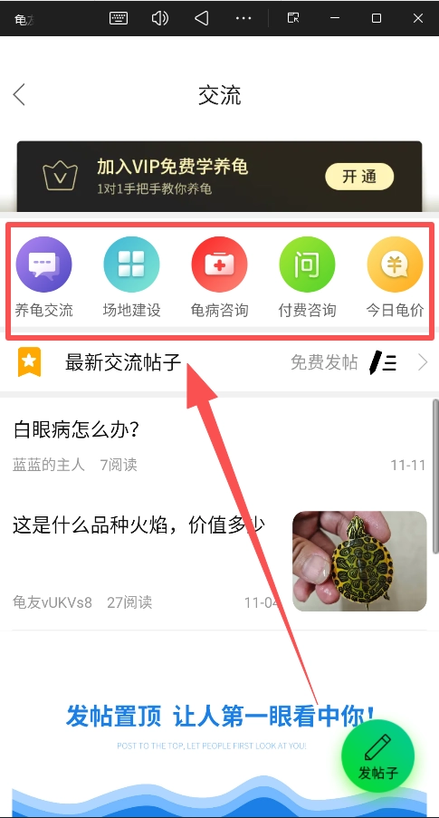 可以在“首页”和“发现”这两个板块里浏览帖子,从中学习养龟的相关知识,同时也能了解到市场的动态信息。