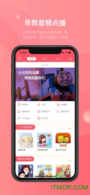 精选蜻蜓FM、喜马拉雅等平台的海量音频资源,故事、英语、国学、儿歌等内容应有尽有。