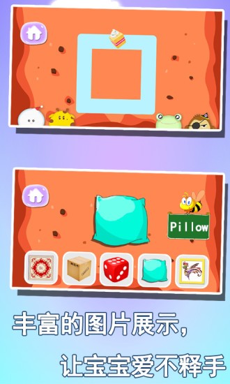 双语配音——本软件采用点读式有声读物形式,语言涵盖汉语、英语及双语三大类别,助力小朋友在认识形状的过程中,通过聆听声音学习说话、拼音与单词,同时对汉字学习和英语学习起到一定的促进与启发作用。