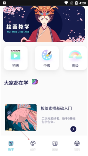 首先大家打开iArtbook绘画的最新版本,接下来我先给大家介绍一下各个板块的使用方法和包含的内容。在画册板块里,大家可以进行新手入门学习,还能找到最新的各类填色内容。