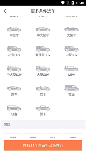 点击“更多”按钮,可设置多种筛选条件,包括价格区间、车辆级别、车辆品牌国别、变速箱类型(自动或手动)、发动机排量等。