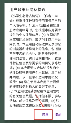 请点击同意按钮,这样就能顺利进入应用主界面,开启您的古诗词学习之旅啦。