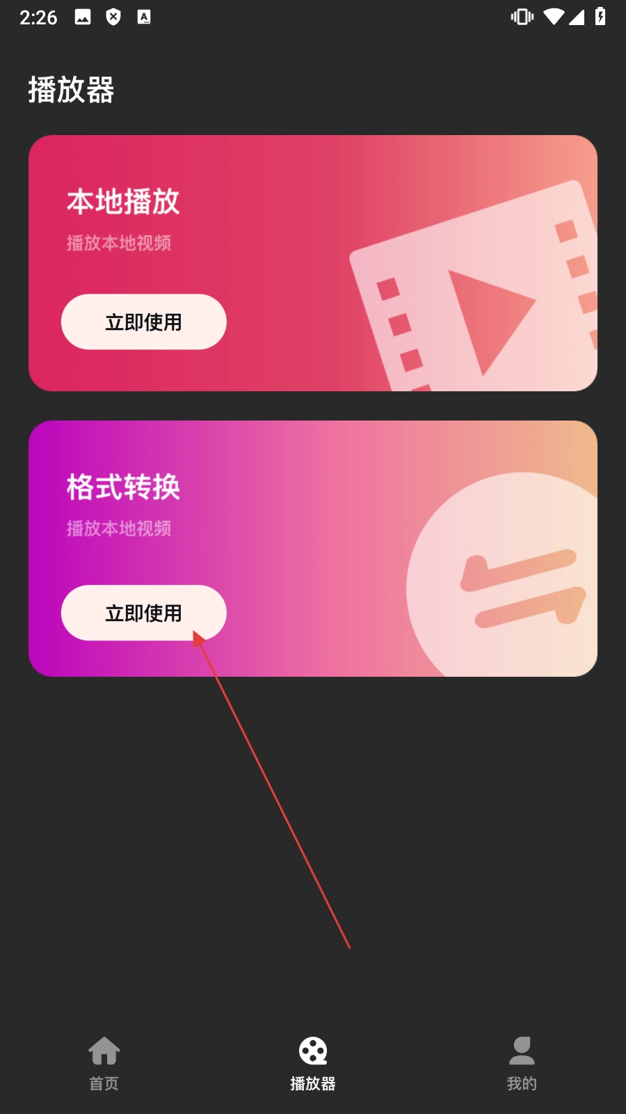 在播放器页面找到【格式转换】选项,点击其下方的【立即使用】按钮,即可进入视频选择页面。