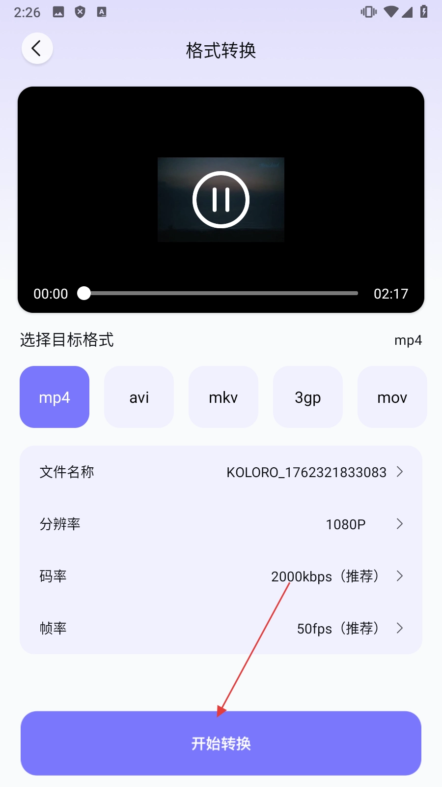 在视频选择界面选定目标视频后,跳转至格式转换的设置界面。