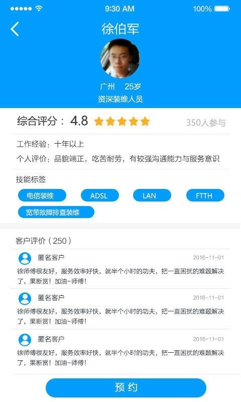 约师傅:随时查看新装电信业务的实时进度,自主选择上门时间和服务师傅,快速预约电信专业工程师上门服务,服务结束后还能对本次服务进行评价反馈。