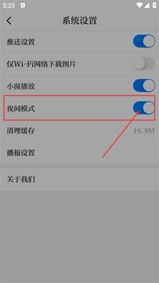 点击【夜间模式】的开关按钮,把它切换到开启状态,应用界面就会同步切换到夜间显示模式。