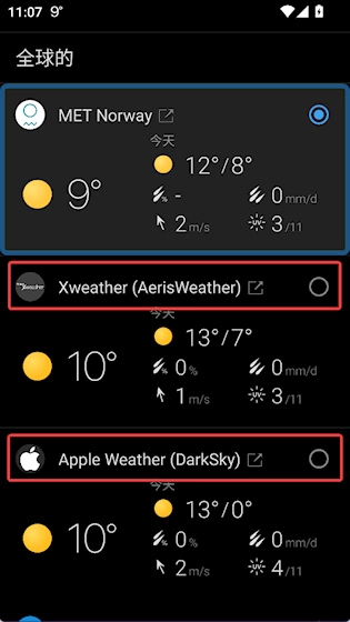 可以选择“Xweather”“Apple Weather”等天气服务提供商。
