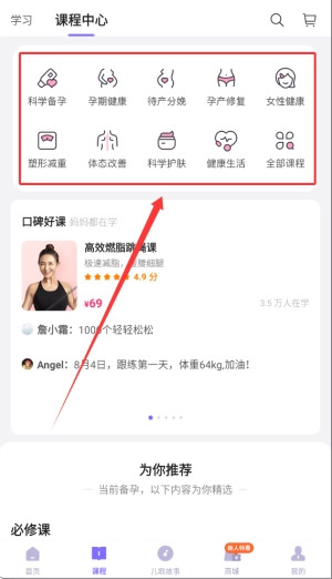 课程板块涵盖备孕指导、孕期护理、产后恢复以及女性健康管理等专业知识内容。