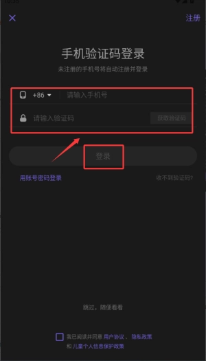 在登录界面填写手机号和验证码后,点击登录按钮即可进入应用。