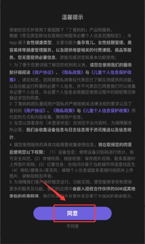 打开丁香妈妈应用后,首先在温馨提示页面点击同意相关协议。