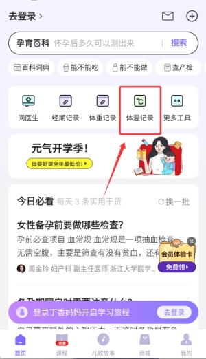 首页可通过底部导航或搜索栏查找孕育百科等内容。