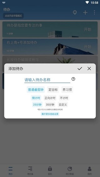 点击右上角的“+”号按钮,即可添加新的待办事项,也就是开启计时功能。