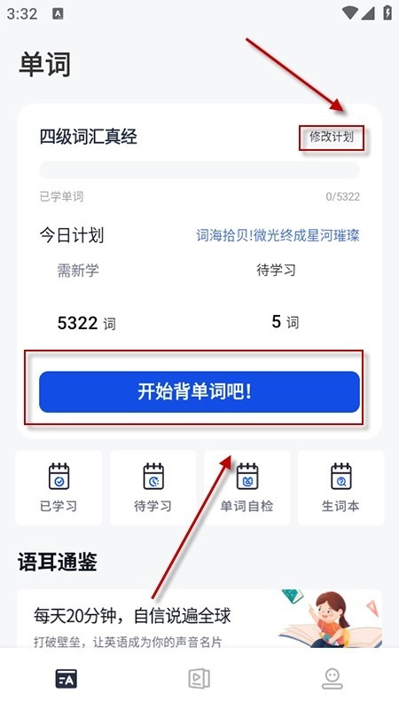 1、在本站内与安装并打开软件,进入首页,点击“修改计划”根据自身学习需求和时间安排,设置每日新学单词数量,也可以修改词书,选择适合自己学习阶段的词库。