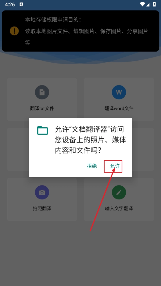 点击“图片”翻译入口,授予相关权限以允许访问,上传图片后就能开展翻译操作了。