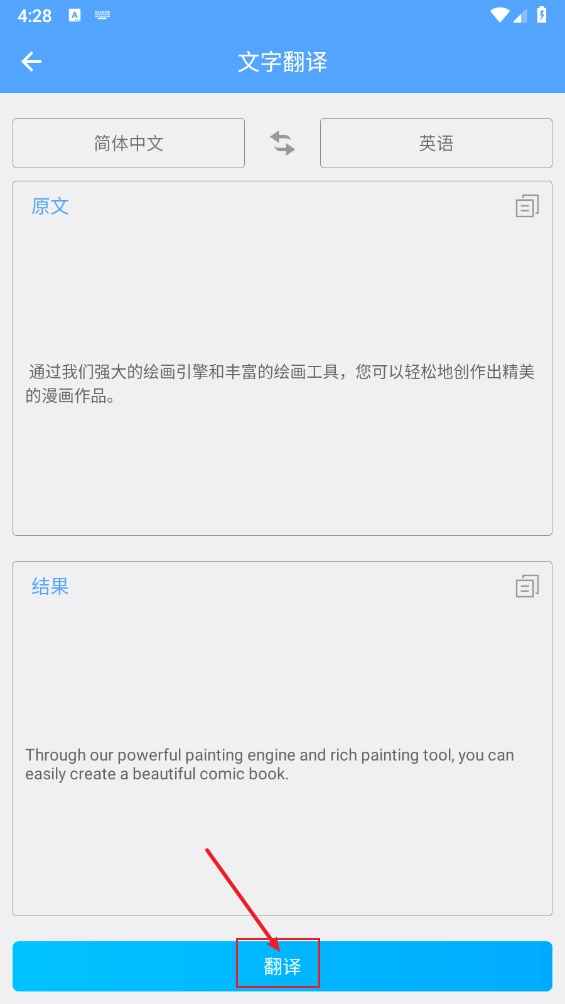 接下来点击文字翻译入口进入,输入需要翻译的原文后,点击“翻译”按钮就可以了。