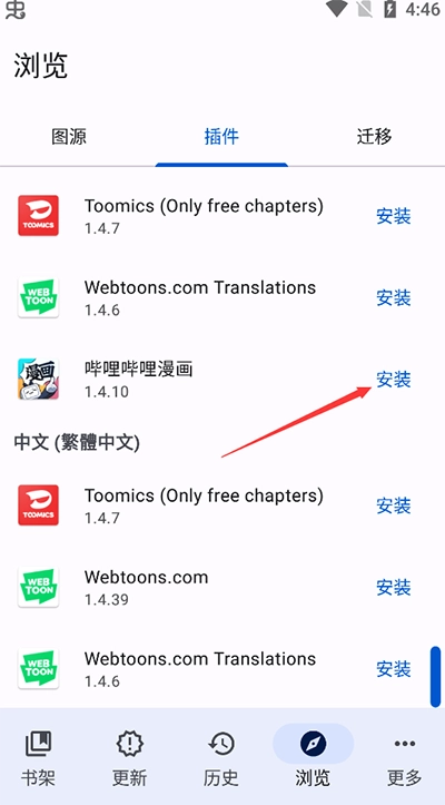 涵盖多个插件,选择所需的漫画插件并点击右边的"安装"。