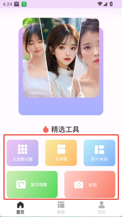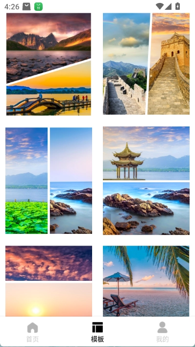拼接模板:拥有各类精美的图片拼接模板,选择喜欢的模板将图片拼接成一张艺术照。