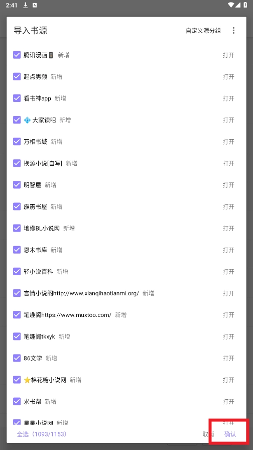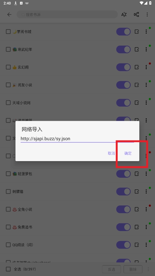 最后勾选所需导入的书源,点击""确认即可。