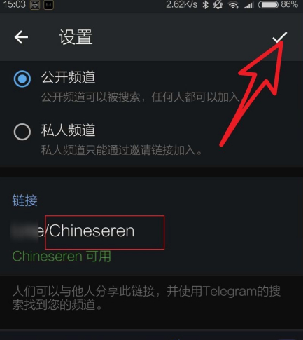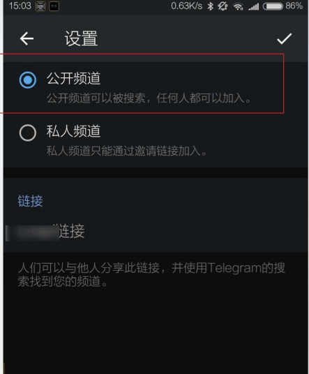 输入完成后点击右上角的对勾,随后需要选择频道类型,可选的有公开频道和私密频道。