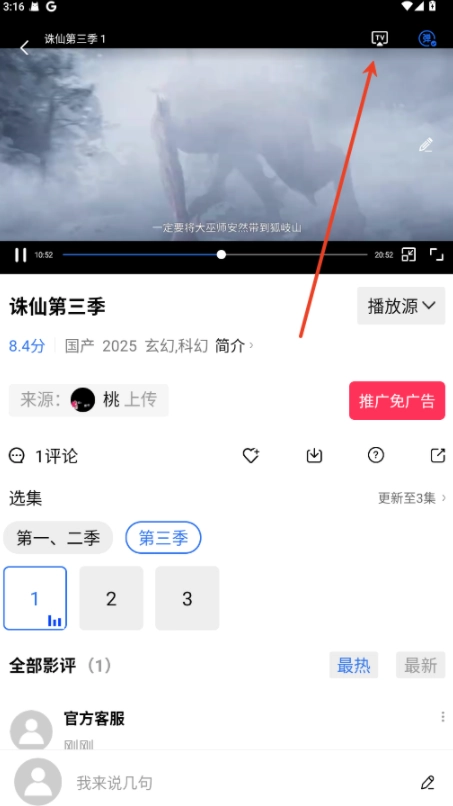 在播放详情页,点击右上方的"tv"标志。