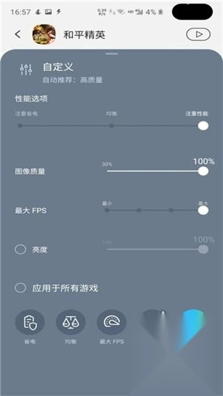 可以为每个游戏自定义性能分配策略,像选择高质量高画质、优先保证帧数或是以省电为优先,从而帮助节省手机电量。
