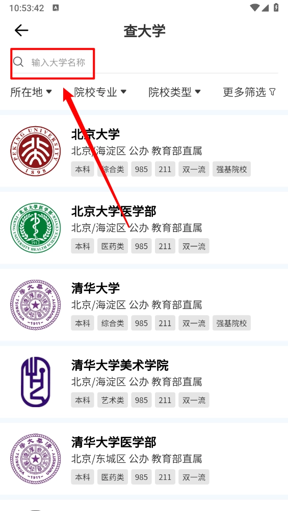 如图所示,进入页面后,你可以筛选出自己喜欢的院校,也能够通过输入院校名称来实现一键搜索。