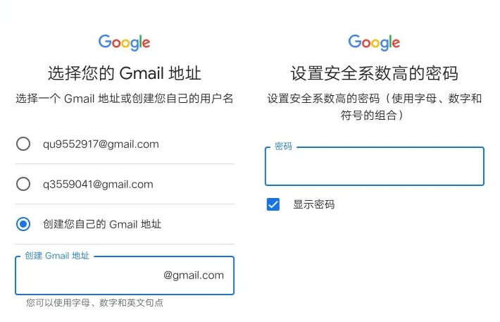 你可以选择现有账户或创建新账户,谷歌会随机提供两个账户选项供你挑选;设置一个由字母、数字和符号组成的复杂密码,并务必牢记。