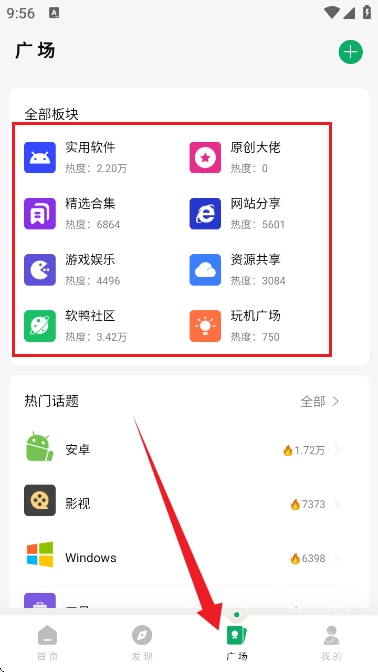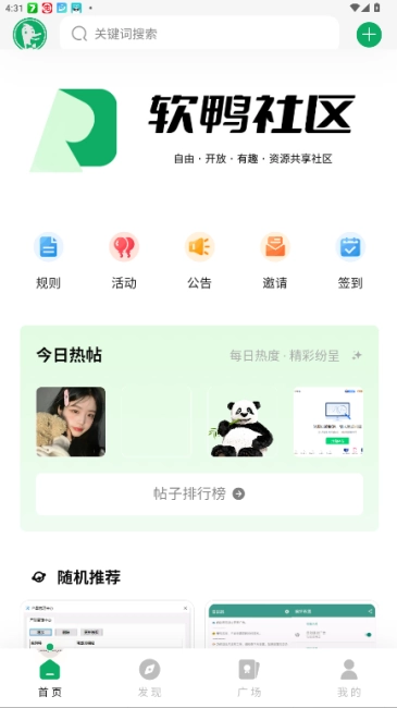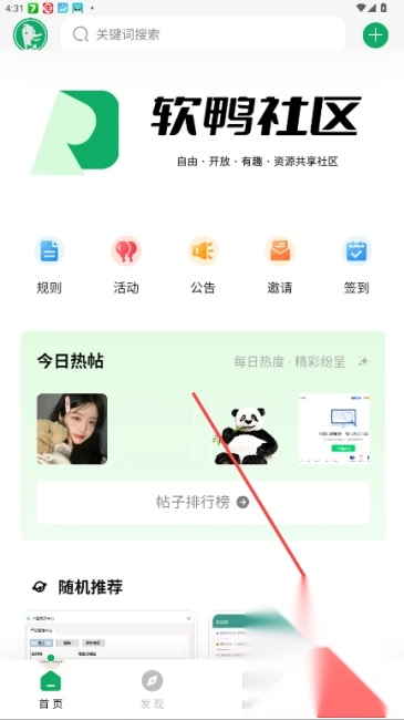 打开软鸭社区后进入软件首页,这里设有多个功能入口,还能看到今日热帖。