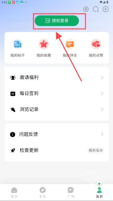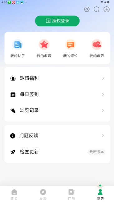 在【我的】页面中可以对社区账号、发布的帖子以及浏览记录进行管理,同时还能参与每日签到活动。