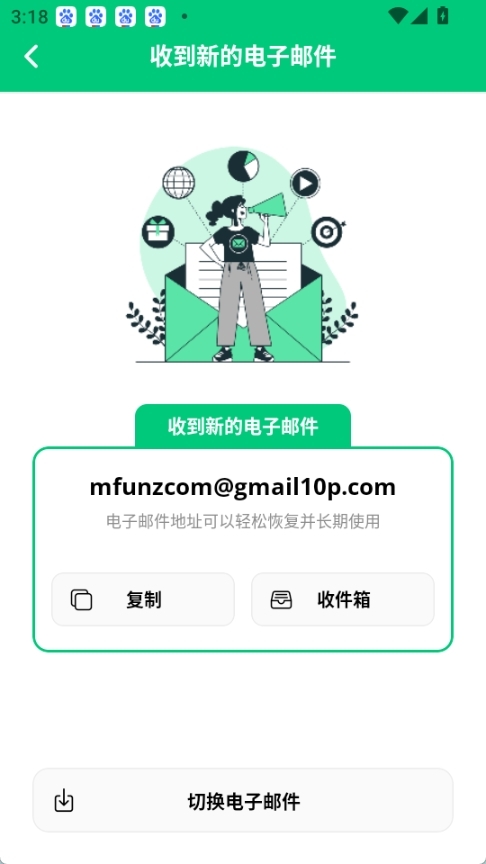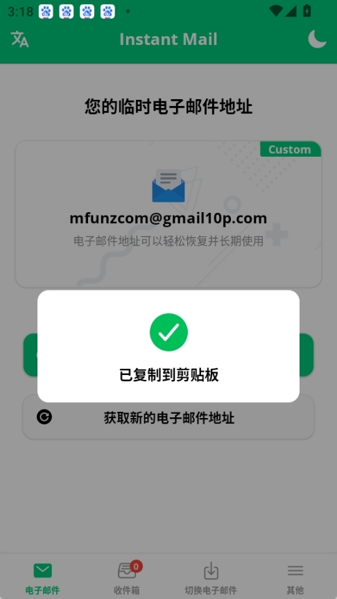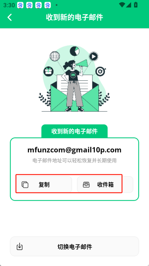 新的临时邮箱已成功获取,您可以直接复制该邮箱地址,也可以点击进入收件箱(此电子邮件地址支持轻松恢复且能长期使用)。