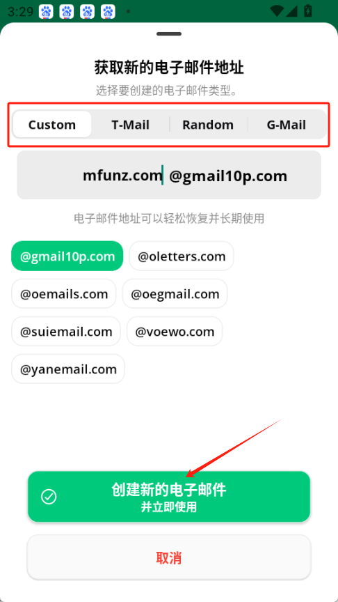 在手机上安装并打开临时邮箱InstantMail,接着按照图示操作,点击获取您的电子邮件地址