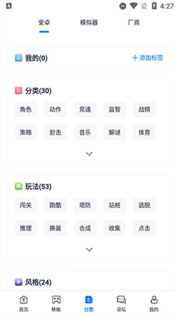 除了包含安卓、模拟器和厂商等分类外,还进一步细分为玩法、风格等多个类别,是一款用于寻找游戏的实用工具。