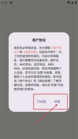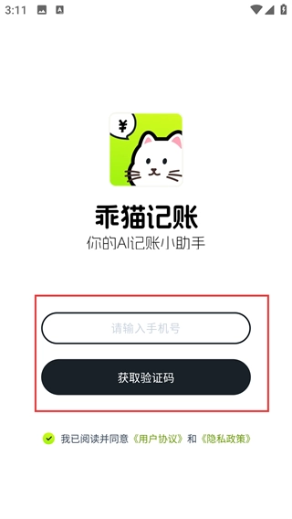 打开乖猫记账后,当弹出【用户协议】弹窗时,点击【同意】按钮,以此确认协议并进入应用的登录或注册流程。