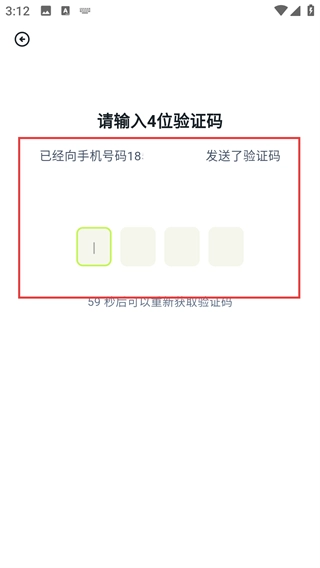 进入验证码输入界面,填写发送到对应手机号码的4位验证码(倒计时结束后可再次获取),完成验证步骤。