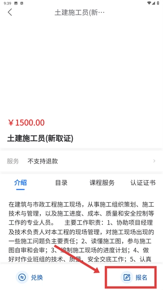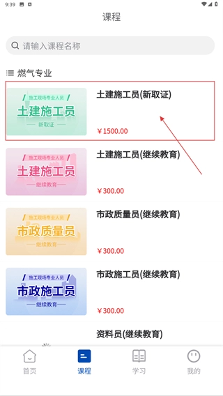 进入课程列表页面后,找到【土建施工员-(新取证)】这一课程条目,点击进入该课程的详情页,查看并了解课程相关信息。