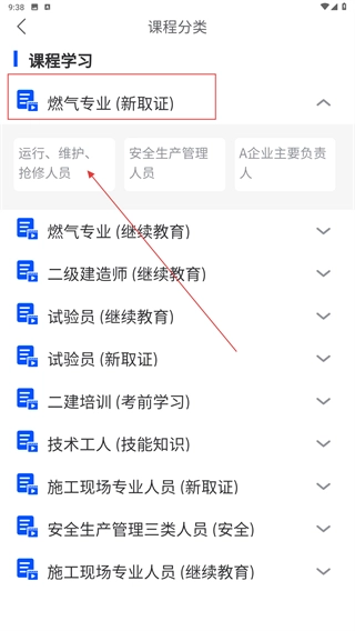 在课程分类页面,先展开类似【燃气专业-(新取证)】这样的分类,接着挑选对应的岗位方向(比如运行-维护-抢修人员),最后筛选出目标课程。