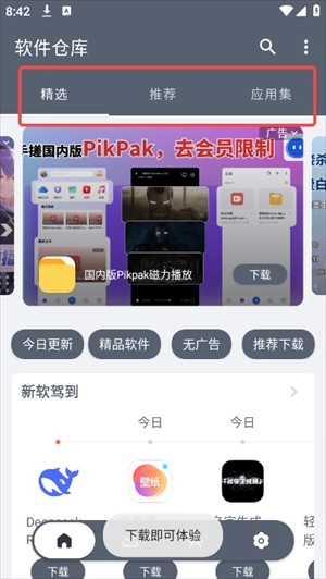 打开软件进入后,首页设有精选、推荐、应用集等板块内容。