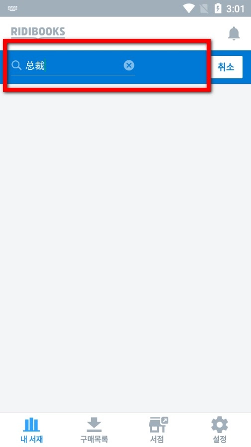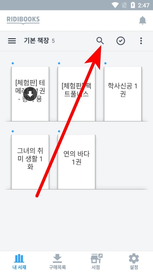 打开RIDIBOOKS应用,然后点击界面上方的搜索图标。