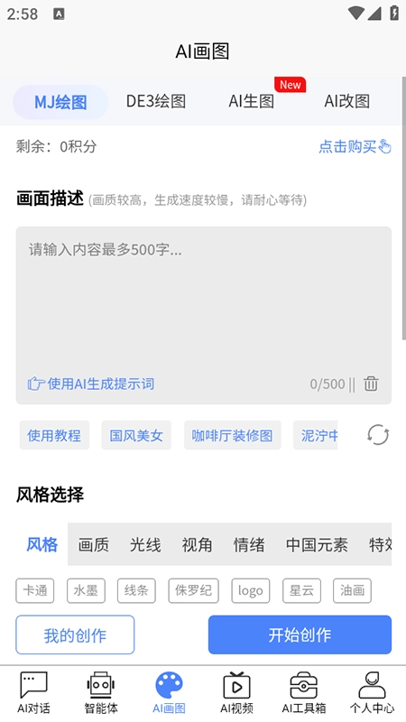 - AI绘画:自主选择类型、风格,生成画面。