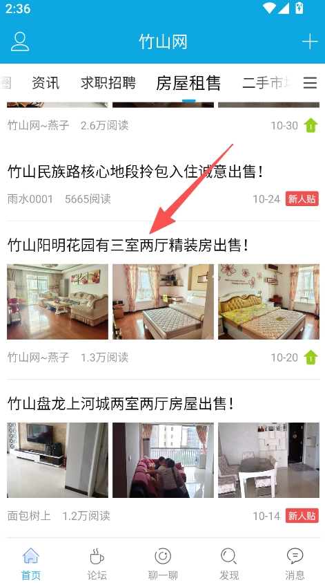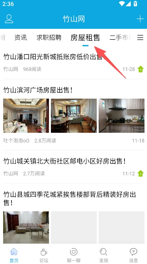 房屋租售板块用于展示本地各类房源信息,不仅会标注每条房源的阅读量、发布者信息以及发布时间,还会呈现丰富多样的本地房屋相关内容。